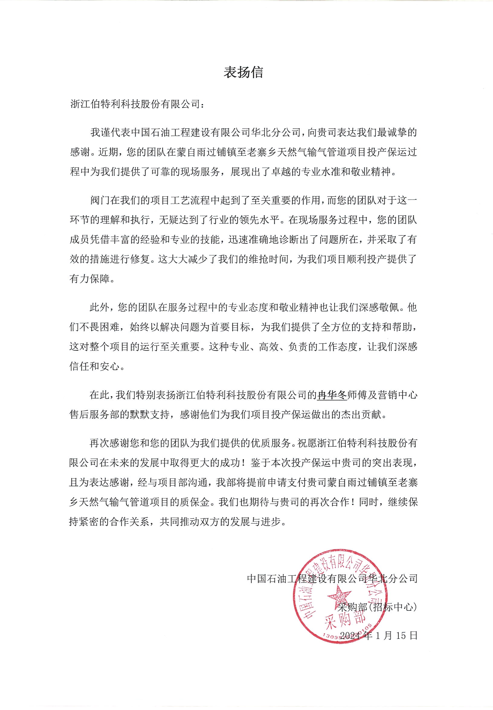 近日,一封從中國(guó)石油工程建設(shè)有限公司華北分公司發(fā)來(lái)的感謝信,再次對(duì)我公司售后團(tuán)隊(duì)出色的表現(xiàn)進(jìn)行了表?yè)P(yáng)。
