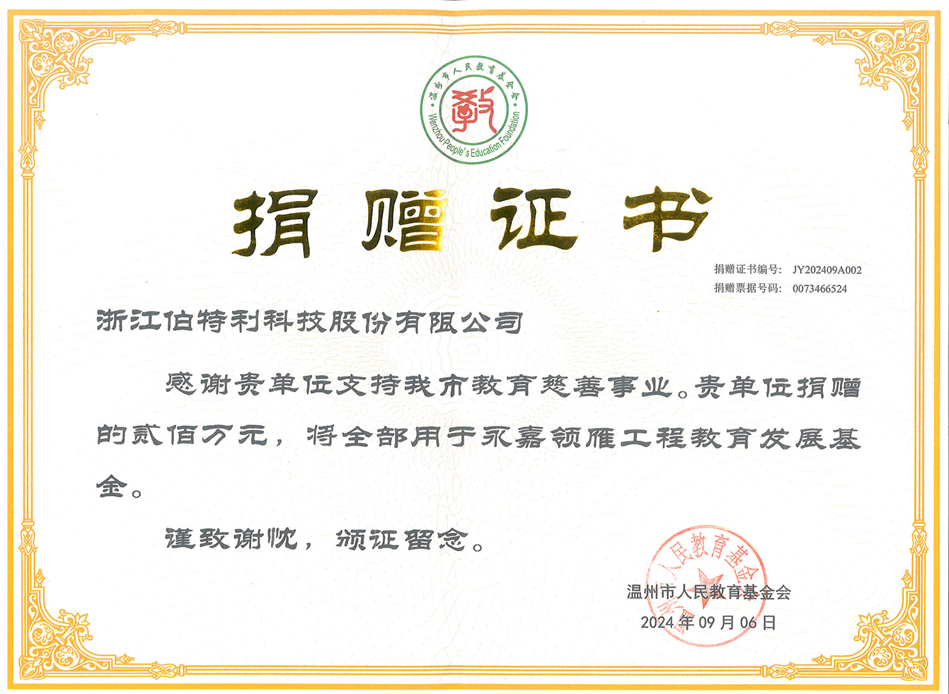 千秋基業(yè),人才為本;十年樹(shù)木,百年樹(shù)人。為貫徹落實(shí)黨的二十大精神以及習(xí)近平總書(shū)記的重要指示精神,全力建設(shè)高素質(zhì)專(zhuān)業(yè)化校長(zhǎng)隊(duì)伍,教師節(jié)前夕,2024 年 9 月 6 日下午,溫州市人民教育基金會(huì)“永嘉領(lǐng)雁工程教育發(fā)展專(zhuān)項(xiàng)基金”簽約捐贈(zèng)儀式在溫銀大廈 1109 會(huì)議室隆重舉行。捐贈(zèng)簽約儀式上,浙江伯特利科技股份有限公司捐贈(zèng)1000萬(wàn)元,用于永嘉縣教育系統(tǒng)優(yōu)秀校長(zhǎng)、優(yōu)秀班主任、優(yōu)秀教師三支隊(duì)伍的獎(jiǎng)勵(lì)和建設(shè),用實(shí)際行動(dòng)支持永嘉教育事業(yè)優(yōu)先發(fā)展,彰顯企業(yè)家的社會(huì)責(zé)任與擔(dān)當(dāng)。
